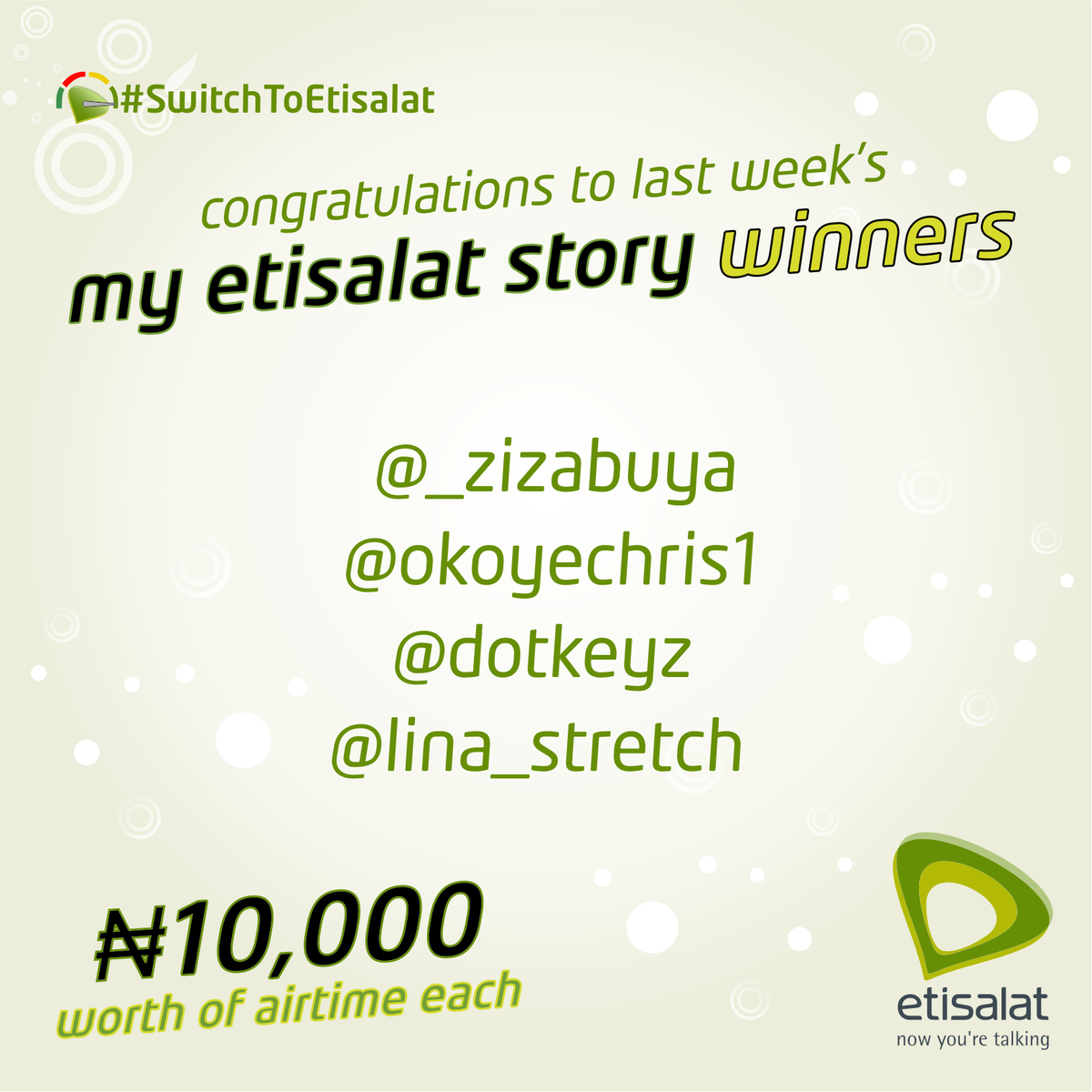 @etisalat_9ja tweeted: Congratulations to last week's #SwitchToEtisalat contest winners. Follow us on #Instagram for this week's contest. RT